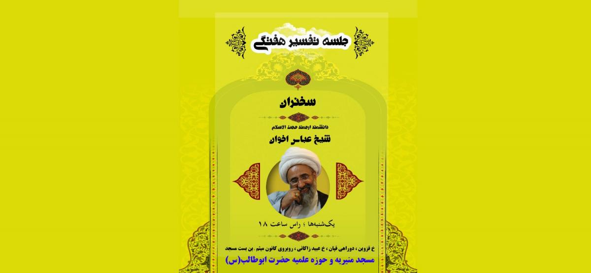 جلسه تفسیر و اخلاق حاج شیخ عباس اخوان، به قرار یکشنبه هر هفته، فردا 26 اردیبهشت 1395 راس ساعت 18 در محل مسجد منیریه و حوزه علمیه ابوطالب(س) برگزار خواهد شد.